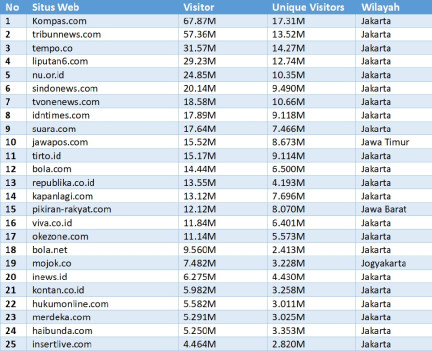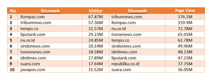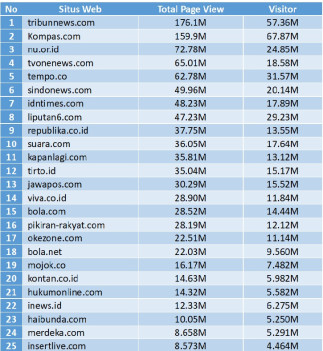 Buan Agustus page view Liputan6.com 47.23M (bulan Juli 40.97M), Republika.co.id di bulan Agustus 37.75M (bulan Juli 28.84M) dan Suara.com bulan Agustus 36.05M (bulan Juli 27.32M).
